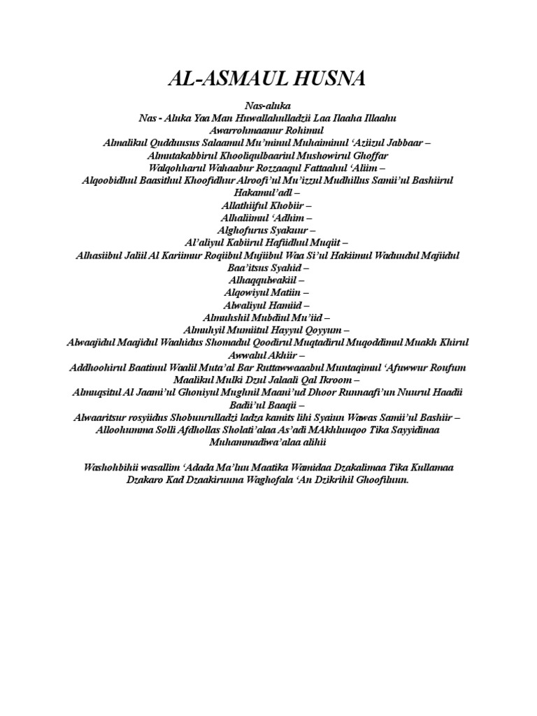 Nas aluka yaa man huwallahulladzii laa ilaaha illaahu awarrohmaanur rohimul almalikul. Sejumlah 99 nama allah tersebut menunjukkan bukti. Itulah 99 asmaul husna latin dan terjemahnya yang bisa menjadi ladang pahala dengan mengucapkannya setiap saat. Beberapa kata dari asmaul husna dapat dijadikan dzikir, begitu juga lagu yang bisa ditemukan di youtube dan mp3. Ini adalah senarai lengkap asmaul husna.